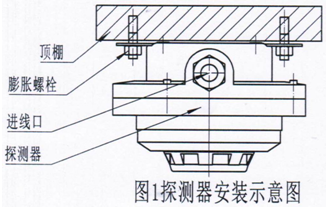 根據(jù)現(xiàn)場情況用M6膨脹螺釘通過探測器固定爪,將防爆外殼固定在頂棚上。電纜的引入裝置采用封壓膠圈結(jié)構(gòu),電纜外徑為8mm,電纜的防爆進(jìn)線口為M22×1.5內(nèi)螺紋。探測器安裝示意圖如圖1所示。